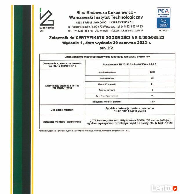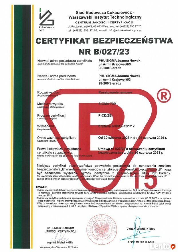Rusztowanie SIGMA 70P posiada certyfikat bezpieczeństwa "B", certyfikat zgodności z kryteriami K/0812-72/1/12, a także certyfikat zgodności z normami PN-EN 12810-1:2010 oraz PN-EN 12811-1:2007 wydane przez Sieć Badawczą Łukasiewicz Warszawski Instytut Technologiczny (dawniej IMBIGS)