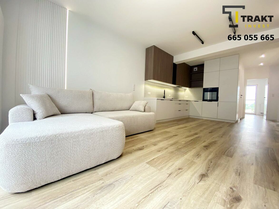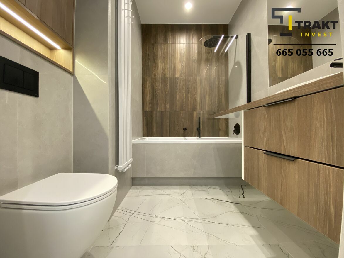 Wszystkie widoczne na zdjęciach meble oraz sprzęty są zupełnie nowe oraz wchodzą w skład ceny. Podczas projektowania i wykańczania zadbano o każdy nawet najmniejszy szczegół, designu dodaje podtynkowa armatura łazienkowa oraz różnorodna struktura użytych materiałów. Plusem jest także zabudowa meblowa wykonana przez stolarza oraz dwa spore balkony.